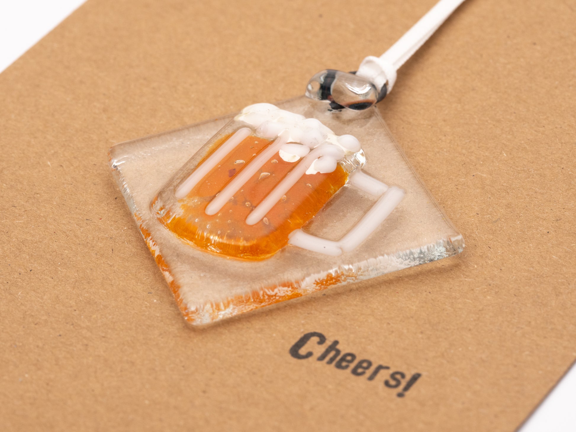 A handmade drinks-card with detachable fused glass token with envelope (4x4cm approx. and satin ribbon.)