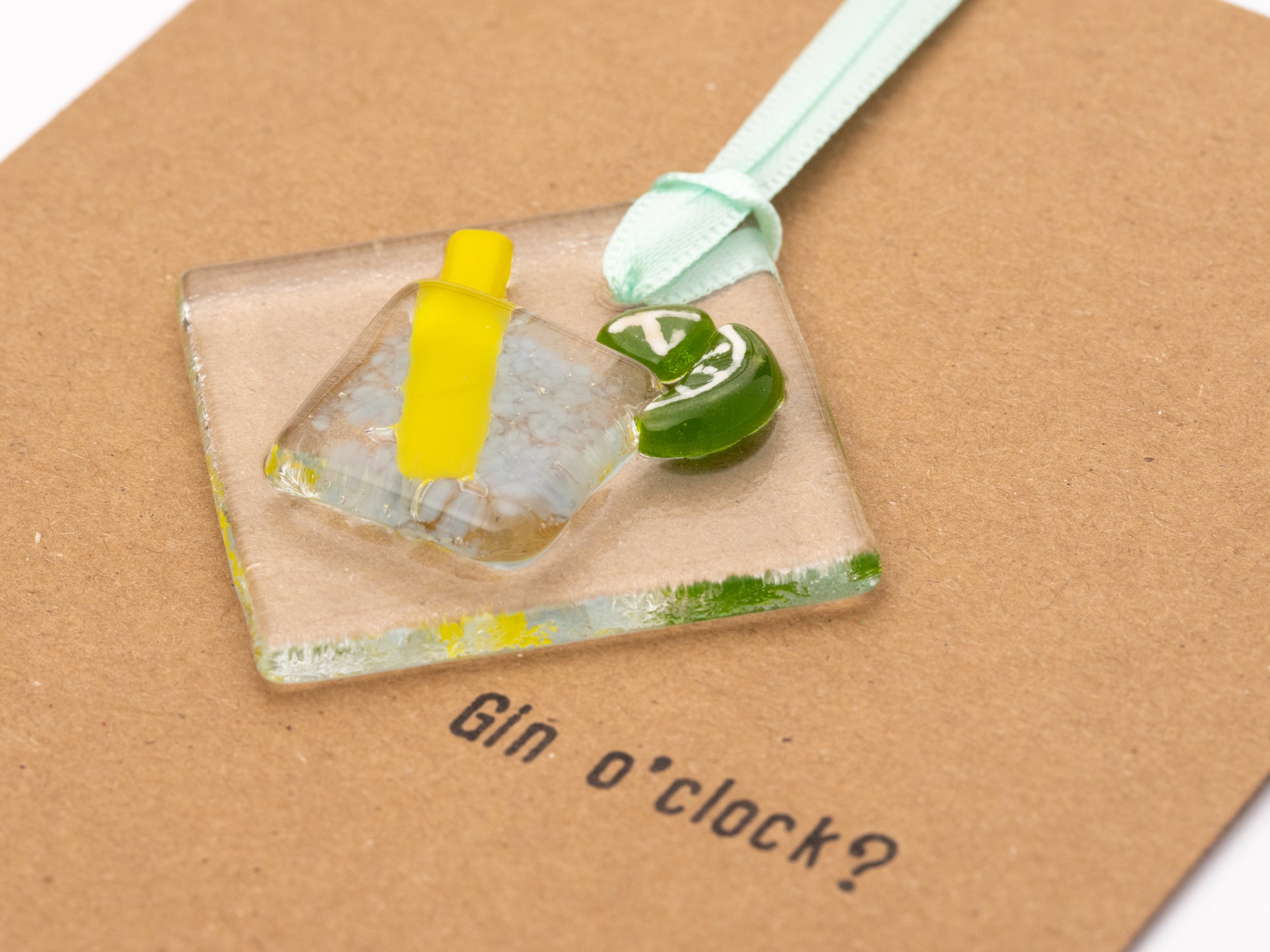 A handmade drinks-card with detachable fused glass token with envelope (4x4cm approx. and satin ribbon.)